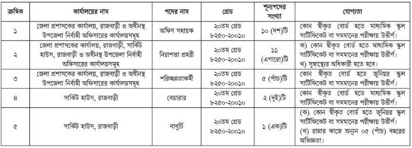 রাজবাড়ী জেলা প্রশাসকের কার্যালয় এবং এর অধীনে উপজেলা নির্বাহী অফিসারের কার্যালয়সমূহ ও সার্কিট হাউজে ৫টি পদে ২৯ জনকে নিয়োগ দেওয়া হবে। আগ্রহীরা আগামী ৩০ নভেম্বর পর্যন্ত অনলাইনের মাধ্যমে আবেদন করতে পারবেন। প্রার্থীকে অবশ্যই রাজবাড়ীর স্থায়ী বাসিন্দা হতে হবে।