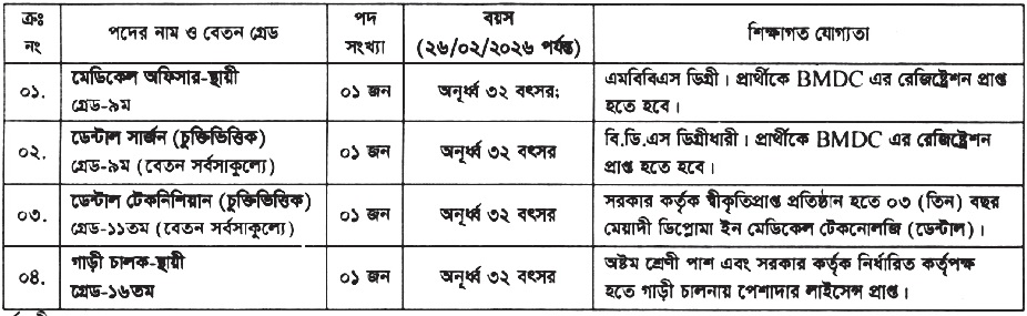 বয়স: ২৬ ফেব্রুয়ারি ২০২৬ তারিখ সর্বোচ্চ ৩২ বছর। বয়স প্রমাণের ক্ষেত্রে কোনো প্রকার এফিডেভিট গ্রহণযোগ্য হবে না।