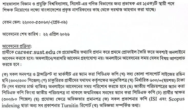 এক নজরে শাহজালাল বিজ্ঞান ও প্রযুক্তি বিশ্ববিদ্যালয়ের (শাবিপ্রবি) নিয়োগ বিজ্ঞপ্তি ২০২৬