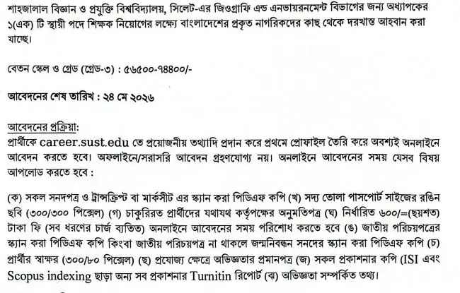 এক নজরে শাহজালাল বিজ্ঞান ও প্রযুক্তি বিশ্ববিদ্যালয়ের (শাবিপ্রবি) নিয়োগ বিজ্ঞপ্তি ২০২৬