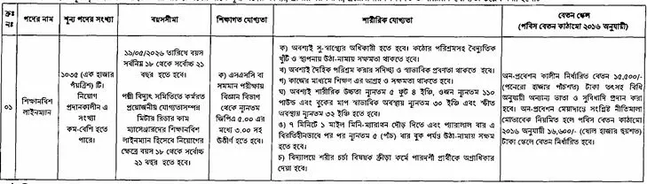 বাংলাদেশ পল্লী বিদ্যুতায়ন বোর্ড (বাপবিবো) ‘শিক্ষানবিশ লাইনম্যান’ পদে ১০৩৫ জনকে নিয়োগের বিজ্ঞপ্তি প্রকাশ করেছে। আগ্রহী প্রার্থীরা পল্লী বিদ্যুতায়ন বোর্ডের নির্ধারিত ফরমের মাধ্যমে আবেদন করতে পারবেন। প্রার্থীকে অবশ্যই এসএসসি অথবা সমমান পাস হতে হবে। আবেদন ফি ২০০ টাকা।