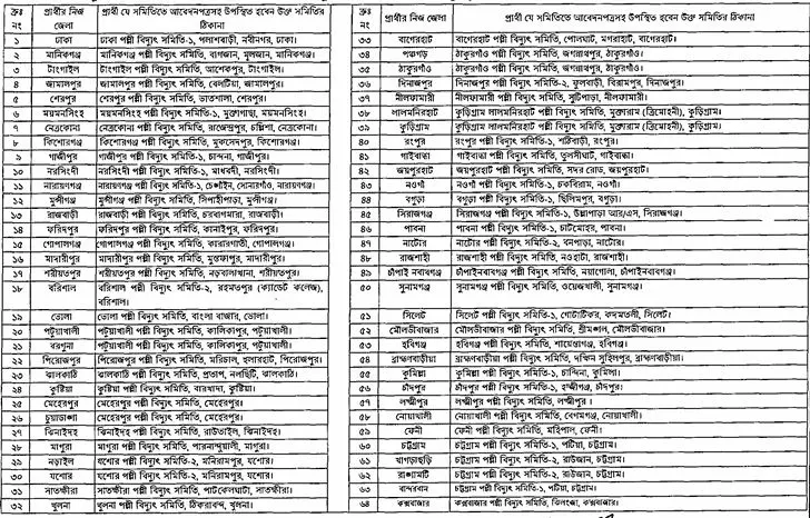 আবেদনের নিয়ম: আগ্রহী প্রার্থীরা শিক্ষাগত যোগ্যতার সত্যায়িত ফটোকপি, নাগরিকত্ব সনদ, জাতীয় পরিচয়পত্রের ফটোকপি এবং ২০০ টাকার ব্যাংক ড্রাফট অথবা পে-অর্ডার/ক্রসড পোস্টাল অর্ডার আবেদনপত্রের সঙ্গে জমা দিতে হবে। আবেদনকারীকে নিজ জেলার পার্শ্বে বর্ণিত পল্লী বিদ্যুৎ সমিতিতে আবেদনপত্র ও চাহিত কাগজপত্রসহ উপস্থিত হতে হবে।