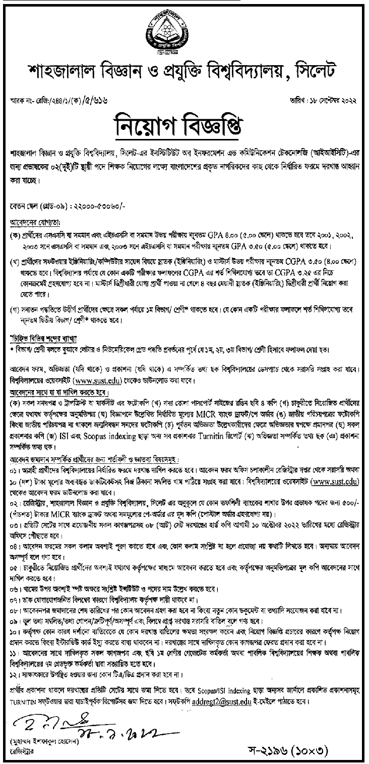আবেদনের ঠিকানা: রেজিস্ট্রার, শাহজালাল বিজ্ঞান ও প্রযুক্তি বিশ্ববিদ্যালয়, সিলেট।
