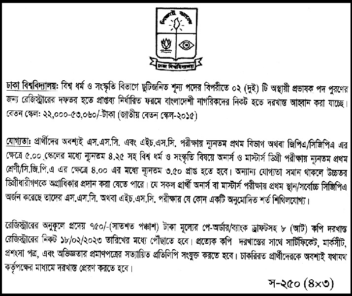 ঢাকা বিশ্ববিদ্যালয়ের (ঢাবি) বিশ্ব ধর্ম ও সংস্কৃতি বিভাগে ‘প্রভাষক’ পদে জনবল নিয়োগ দেওয়া হবে। আগ্রহীরা আগামী ১৮ ফেব্রুয়ারি পর্যন্ত আবেদন করতে পারবেন।