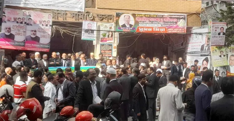 মঙ্গলবার (২ জানুয়ারি) তারা আদালত বর্জনের পর বিক্ষোভ মিছিল বের করেন। মিছিলটি ঢাকার মেট্রোপলিটন ম্যাজিস্ট্রেট আদালত ও মহানগর দায়রা জজ আদালত প্রদক্ষিণ করে ঢাকা আইনজীবী সমিতির সামনে গিয়ে শেষ হয়। এসময় তারা ‘ডামি নির্বাচন’ বন্ধের দাবিতে নানান স্লোগান দেন।