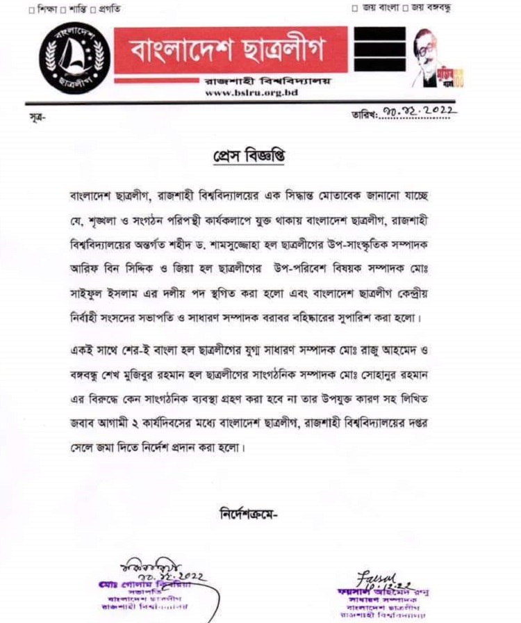 প্রেস বিজ্ঞপ্তিতে বলা হয়, রাজশাহী বিশ্ববিদ্যালয় ছাত্রলীগের এক সিদ্ধান্ত মোতাবেক জানানো যাচ্ছে যে, শৃঙ্খলা ও সংগঠন পরিপন্থি কার্যকলাপে যুক্ত থাকায় বিশ্ববিদ্যালয়ের অন্তর্গত শহীদ ড. শামসুজ্জোহা হল ছাত্রলীগের উপ-সাংস্কৃতিক সম্পাদক আরিফ বিন সিদ্দিক ও জিয়া হল ছাত্রলীগের উপ-পরিবেশ বিষয়ক সম্পাদক মো. সাইফুল ইসলামের দলীয় পদ স্থগিত করা হলো। বাংলাদেশ ছাত্রলীগ কেন্দ্রীয় নির্বাহী সংসদের সভাপতি ও সাধারণ সম্পাদক বরাবর বহিষ্কারের সুপারিশ করা হলো।