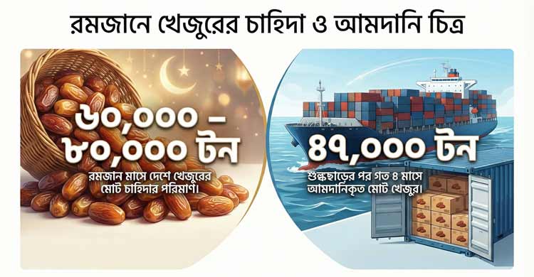 রমজানের গুরুত্বপূর্ণ খাদ্যপণ্যের মধ্যে একটি খেজুর। বাণিজ্য মন্ত্রণালয় সূত্রে জানা যায়, রমজানে খেজুরের চাহিদা ৬০ থেকে ৮০ হাজার টন। আর শুল্কছাড়ের আগে ও পরে শেষ চার মাসে ৪৭ হাজার টন খেজুর আমদানি হয়েছে।