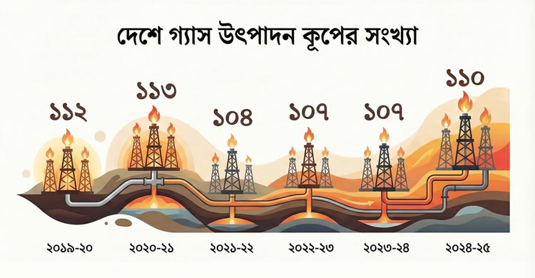হাইড্রোকার্বন ইউনিটের তথ্য বলছে, দেশে গ্যাস উৎপাদন কূপের সংখ্যা ২০১৯-২০ অর্থবছরে ১১২টি, ২০২০-২১ অর্থবছরে ১১৩টি, ২০২১-২২ অর্থবছরে ১০৪টি, ২০২২-২৩ অর্থবছরে ১০৭টি, ২০২৩-২৪ অর্থবছরে ১০৭টি এবং ২০২৪-২৫ অর্থবছরে ছিল ১১০টি।