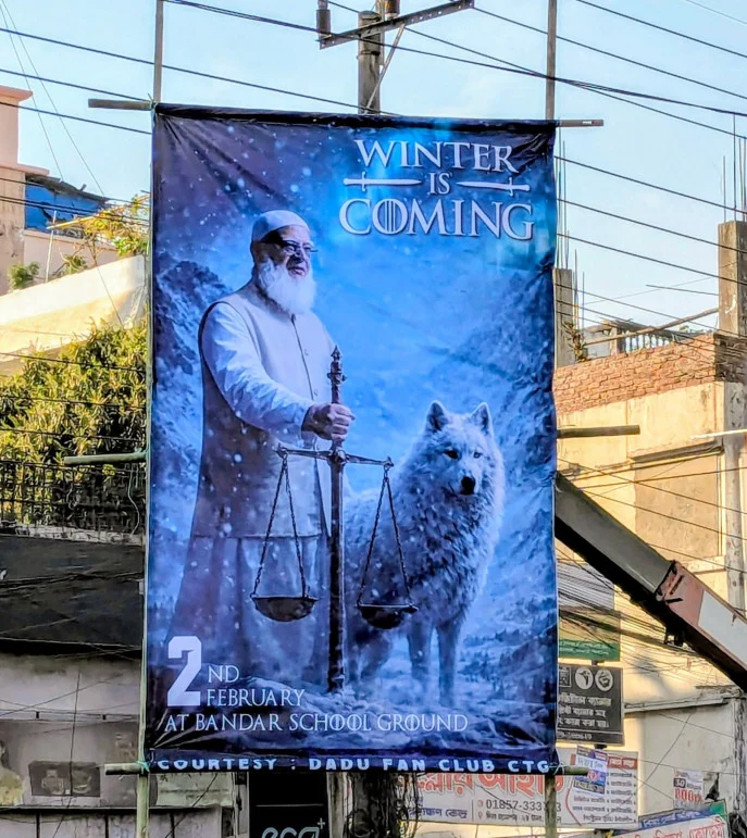 চট্টগ্রামের বড়পোল ও চকবাজার এলাকায় দেখা গেছে ‘গেম অব থ্রোন্স’ স্টাইলে ব্যানার বাসানো হয়েছে জামায়াতের আমিরের। ব্যানারে লেখা ছিল ‘উইন্টার ইজ কামিং’। সেখানে শফিকুর রহমানকে তলোয়ার হাতে দাঁড়িয়ে দেখানো হয়েছে। নিচে উল্লেখ ছিল ‘দাদু ফ্যান ক্লাব চট্টগ্রাম’।