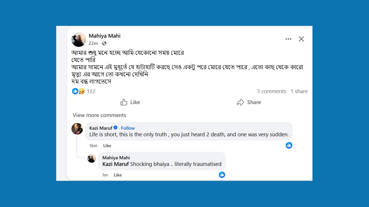 মাহি আরও লেখেন, ‘আমার সামনে এই মুহূর্তে যে হাঁটাহাঁটি করছে সেও একটু পরে মরে যেতে পারে। এত কাছ থেকে কারও মৃত্যু এর আগে কখনো দেখিনি, দম বন্ধ লাগতেছে।’