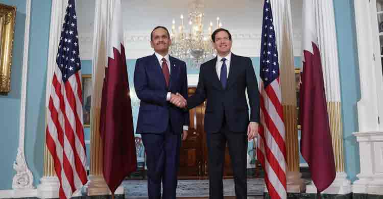 বুধবার (১৭ ডিসেম্বর) ওয়াশিংটনে মার্কিন পররাষ্ট্রমন্ত্রী মার্কো রুবিওর সঙ্গে বৈঠক করেন কাতারের প্রধানমন্ত্রী শেখ মোহাম্মদ বিন জসিম আল-থানি/ ছবি: এএফপি