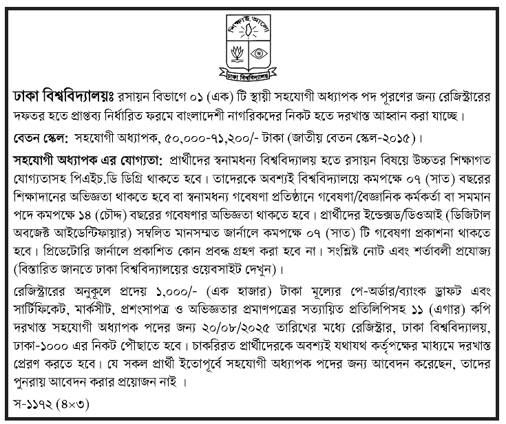 আবেদনের ঠিকানা: রেজিস্ট্রার, ঢাকা বিশ্ববিদ্যালয়, ঢাকা-১০০০।