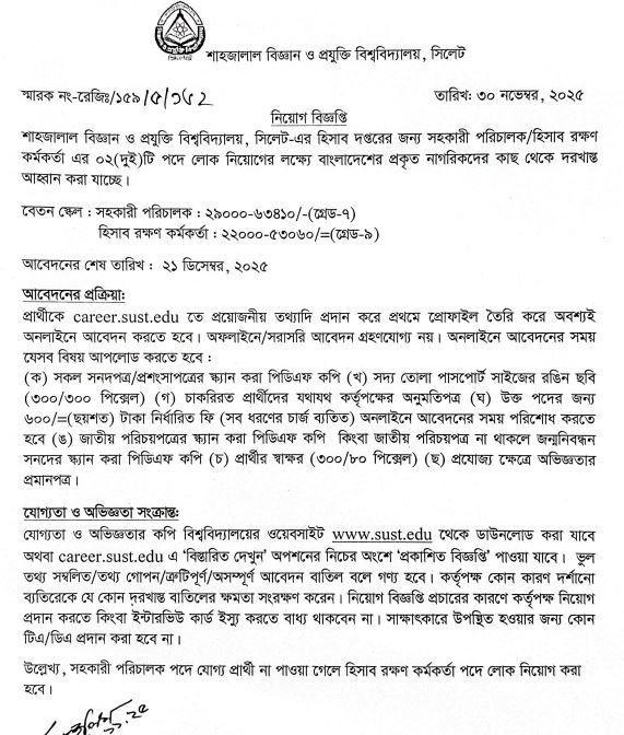 সিলেটের শাহজালাল বিজ্ঞান ও প্রযুক্তি বিশ্ববিদ্যালয়ের (শাবিপ্রবি) হিসাব দপ্তরে ‘কর্মকর্তা’ পদে নিয়োগ দেওয়া হবে। আগ্রহীরা আগামী ২১ ডিসেম্বর পর্যন্ত অনলাইনের মাধ্যমে আবেদন করতে পারবেন। অফলাইন অথবা সরাসরি কোনো আবেদন গ্রহণযোগ্য হবে না।