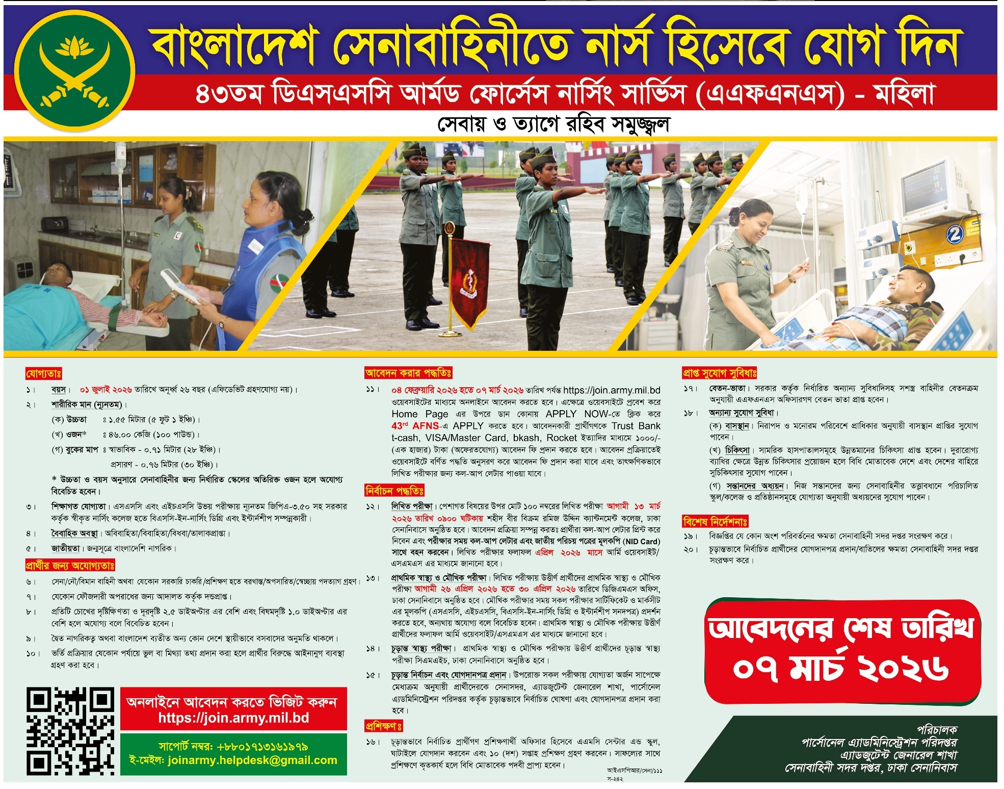 বাংলাদেশ সেনাবাহিনীতে ৪৩তম ডিএসএসসি আর্মড ফোর্সেস নার্সিং সার্ভিসে (এএফএনএস) জনবল নিয়োগ দেওয়া হবে। আগ্রহীরা আগামী ৭ মার্চ পর্যন্ত অনলাইনের মাধ্যমে আবেদন করতে পারবেন। ২৬ বছর বয়স পর্যন্ত শুধুমাত্র নারী প্রার্থীরা আবেদনের সুযোগ পাবেন।