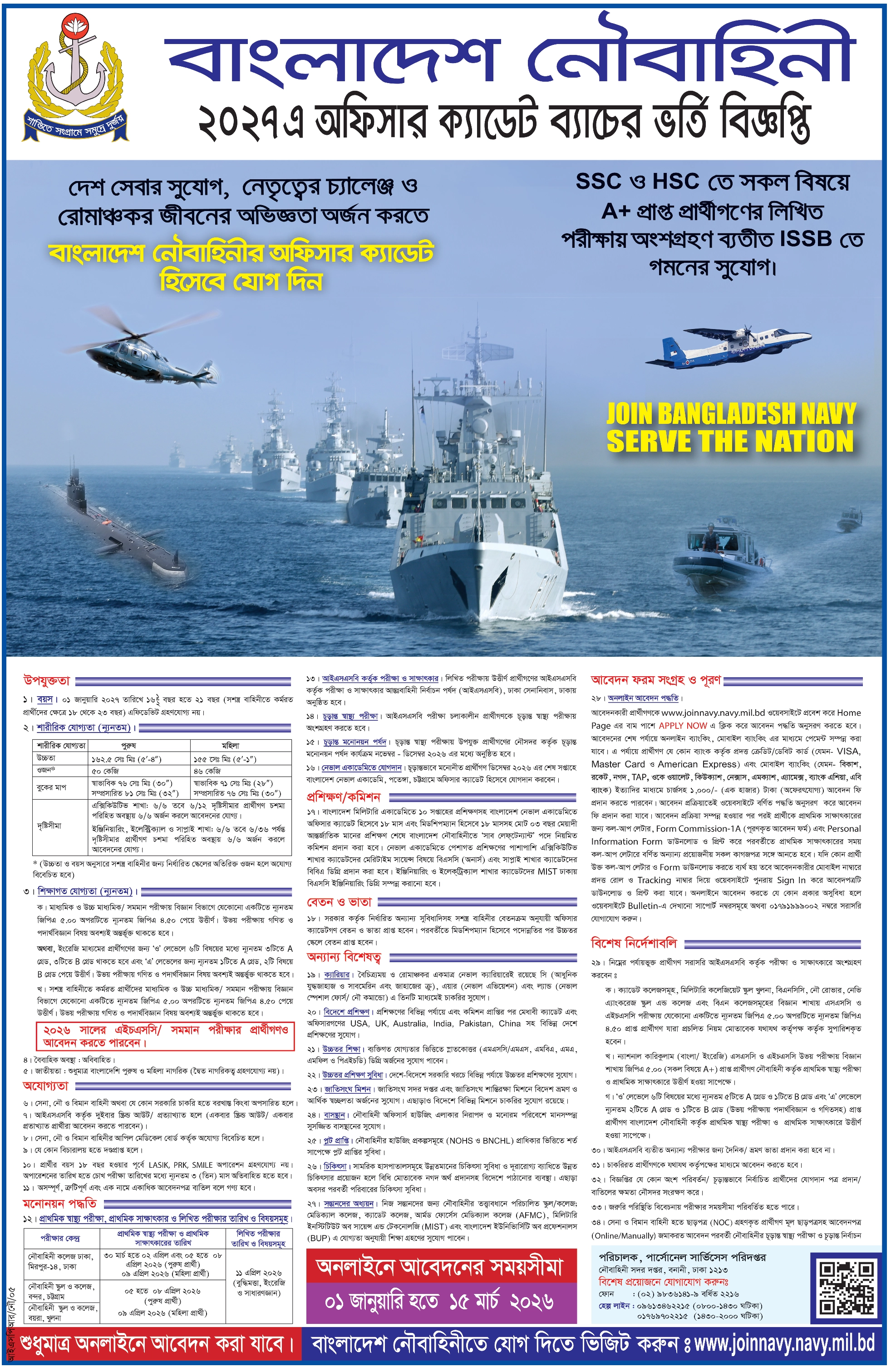 বাংলাদেশ নৌবাহিনীতে ২০২৭-এ অফিসার ক্যাডেট ব্যাচে জনবল নিয়োগ দেওয়া হবে। আগ্রহীরা আগামী ২৮ মার্চ পর্যন্ত আবেদন করতে পারবেন। সাড়ে ১৬ বছর বয়স হলেই প্রার্থীরা আবেদনের সুযোগ পাবেন।