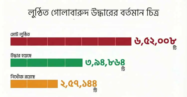 এছাড়া লুণ্ঠিত গোলাবারুদের সংখ্যা ছিল ৬ লাখ ৫২ হাজার ৮টি। এখন পর্যন্ত উদ্ধার হয়েছে ৩ লাখ ৯৪ হাজার ৮৬৪টি গোলাবারুদ। উদ্ধার হয়নি ২ লাখ ৫৭১৪৪টি।
