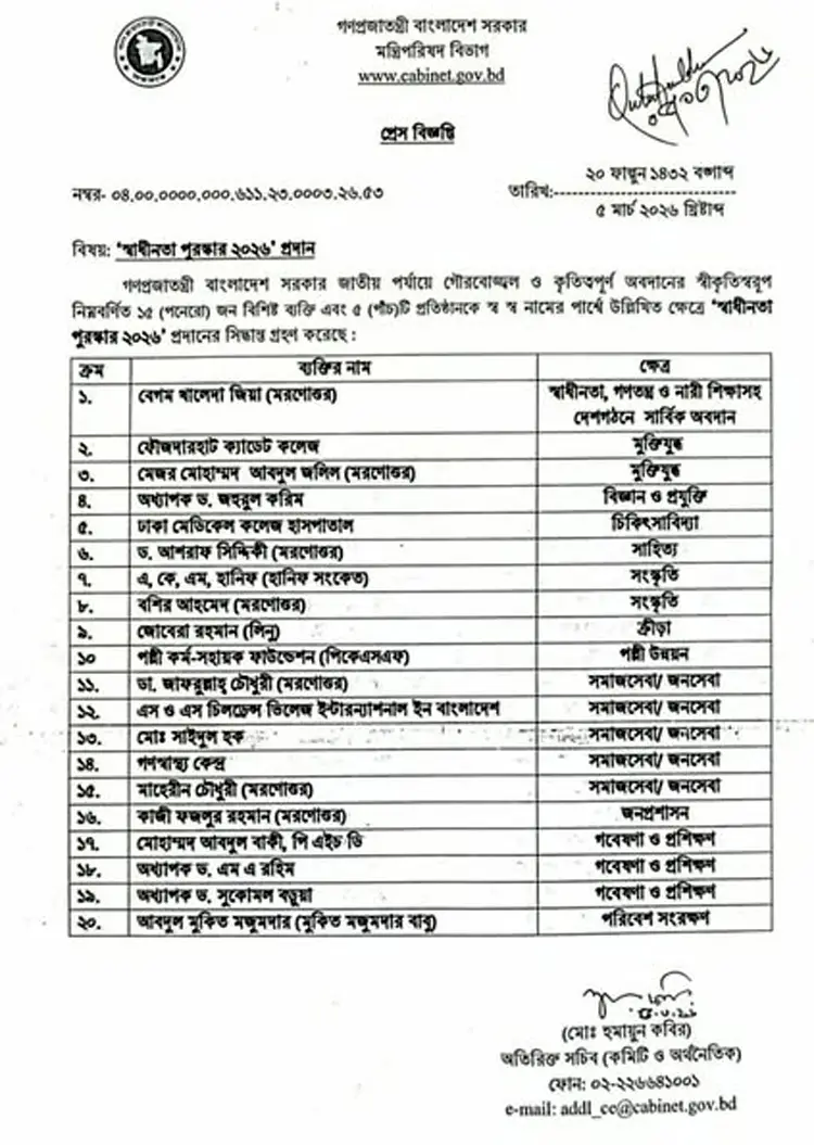 জাতীয় পর্যায়ে গৌরবোজ্জ্বল ও কৃতিত্বপূর্ণ অবদানের স্বীকৃতি হিসেবে বিএনপির প্রয়াত চেয়ারপারসন খালেদা জিয়া (মরণোত্তর), সংগীতশিল্পী বশির আহমেদ (মরণোত্তর), সংস্কৃতিক ব্যক্তিত্ব হানিফ সংকেতসহ ২০ ব্যক্তি-প্রতিষ্ঠান ২০২৬ সালের স্বাধীনতা পুরস্কার পাচ্ছেন।