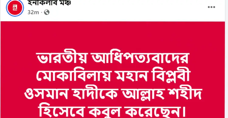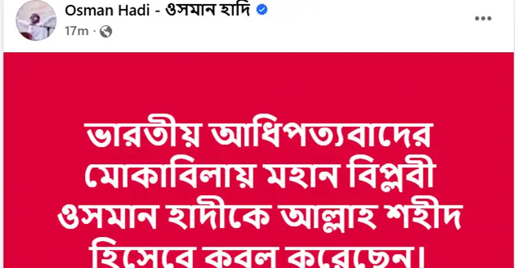 এদিকে তার মৃত্যুর বিষয় নিশ্চিত করে ফেসবুকে পোস্ট দিয়েছে ইনকিলাব মঞ্চ এবং ওসমান হাদির অফিসিয়াল ফেসবুক পেজ। সেখানে লেখা হয়েছে, ‘ভারতীয় আধিপত্যবাদের মোকাবিলায় মহান বিপ্লবী ওসমান হাদীকে আল্লাহ শহীদ হিসেবে কবুল করেছেন।’
