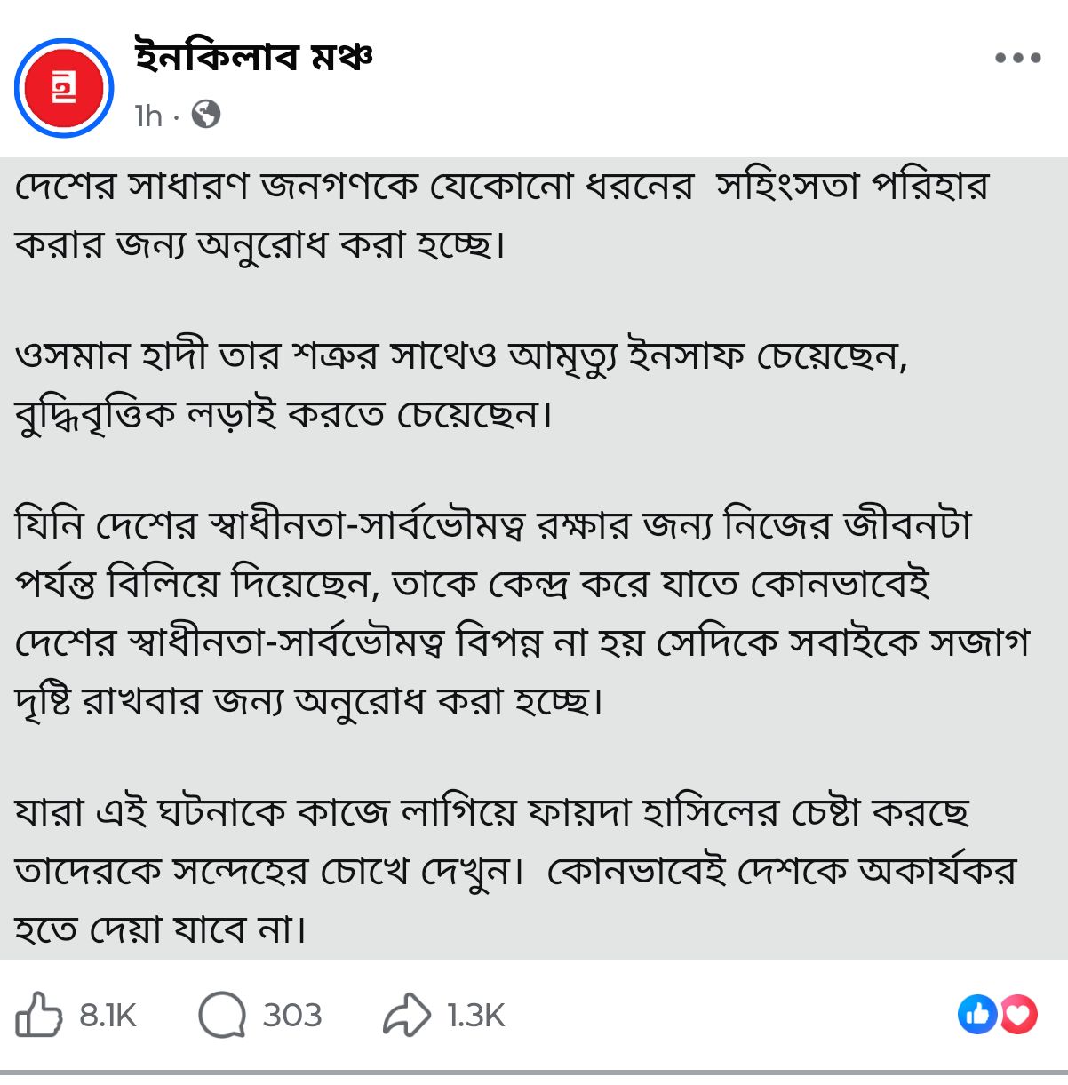 দেশের সাধারণ জনগণকে যে কোনো ধরনের সহিংসতা পরিহারের অনুরোধ জানিয়েছে ওসমান হাদির ইনকিলাব মঞ্চ। হাদির মৃত্যুর সংবাদে বিভিন্ন স্থানে বিক্ষোভের পাশাপাশি হামলা-ভাঙচুরের ঘটনার পর ইনকিলাব মঞ্চের ফেসুবক পেজ ও হাদির পেজ থেকে এ অনুরোধ জানানো হয়।