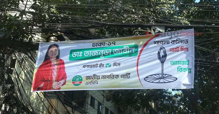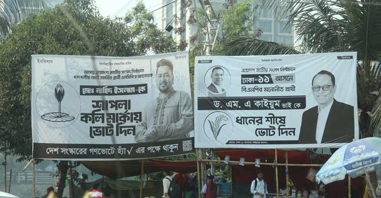 রামপুরা-বাড্ডা এলাকায় ঢাকা-১১ আসনে বিএনপির প্রার্থী এম এ কাইয়ুম ও জামায়াত জোট থেকে এনসিপির প্রার্থী নাহিদ ইসলামের বড় বড় পিভিসি ব্যানার দেখা গেছে সড়কজুড়ে। এছাড়া কাপড়ের ব্যানার তো আছেই।