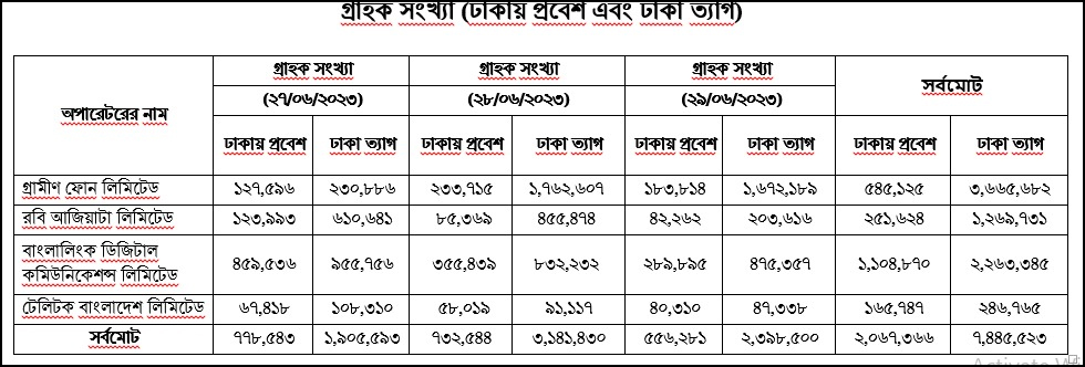 অপরদিকে, তিনদিনে ঢাকায় প্রবেশকারীদের মধ্যে গ্রামীণ ফোনের ৫ লাখ ৪৫ হাজার ১২৫ গ্রাহক, রবি আজিয়াটা লিমিটেডের ২ লাখ ৫১ হাজার ৬২৪ গ্রাহক, বাংলালিংক ডিজিটাল কমিউনিকেশন লিমিটেডের ১১ লাখ ৪ হাজার ৮৭০ গ্রাহক এবং টেলিটক বাংলাদেশ লিমিটেডের ১ লাখ ৬৫ হাজার ৭৪৭ গ্রাহক রয়েছে।