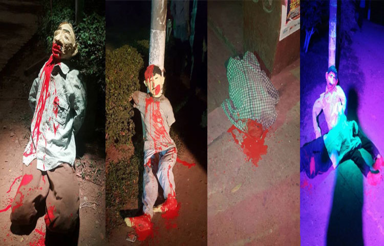 ১৯৭১ সালের ২৫ মার্চ কালোরাতে এভাবে হত্যাযজ্ঞে মেতে ওঠে পাকিস্তানি হানাদার বাহিনী। সে সময়ের হত্যাযজ্ঞটি কেমন ছিল তা নতুন প্রজন্মকে জানাতেই শুক্রবার দিবাগত রাতে ঢাবির জগন্নাথ হলে এমন ইনস্টলেশন আর্টের প্রদর্শনী করা হয়।
