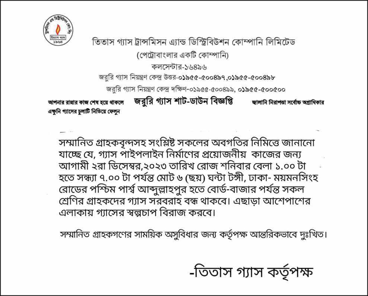 শুক্রবার (১ ডিসেম্বর) তিতাস গ্যাস ট্রান্সমিশন কোম্পানির পক্ষ থেকে এক বিজ্ঞপ্তিতে এ তথ্য জানানো হয়েছে।