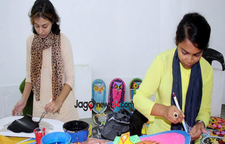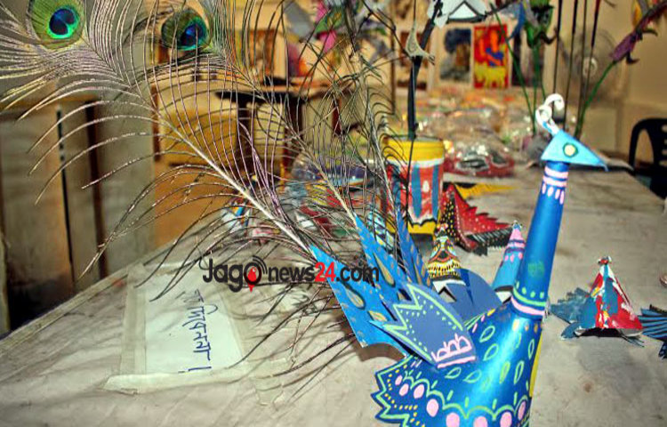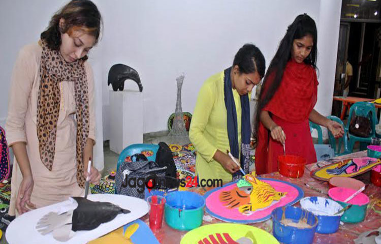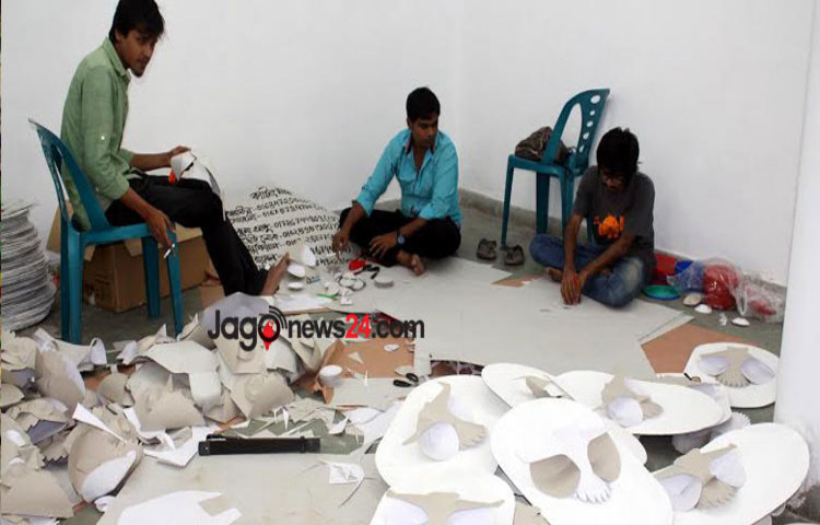 মঙ্গলবার বিকেলে চারুকলায় ঢুকে দেখা যায়, প্রস্তুতি চলছে পুরোদমে। মূল গেইট দিয়ে প্রবেশ করতেই দেখা যায় হাতের বাম পাশে বিভিন্ন প্রাণীর মুখোশ ও সরা তৈরির কাজ করছেন কয়েকজন শিক্ষার্থী। আবার ডান পাশে চলছে রং তুলির কাজ। একদম দক্ষিণ-পশ্চিম কর্নারে সাজানো হয়েছে ইতোমধ্যে তৈরি হওয়া শিল্প-কর্মসমূহ। এর থেকে একটু সামনে এগুলো দেখা যায়, পেপারম্যাট মস্কের মুখোশ। যাতে স্থান পায় রাজা-রাণীসহ বিভিন্ন প্রাণীর মুখোশও। তার একটু সামনে গেলে দেখা যায় বাগানের মধ্যে বাঁশের চটা বেঁধে শিক্ষার্থীরা তৈরি করেছেন বাঘ, হাঁস, বিড়াল, শখের হাঁড়ি, শিশু হরিণ, পেঁচা, কাগুজে বাঘ, ছোট-বড়-মাঝারি আকৃতির পাখিসহ দারুণ সব মোটিফের কাঠামো।