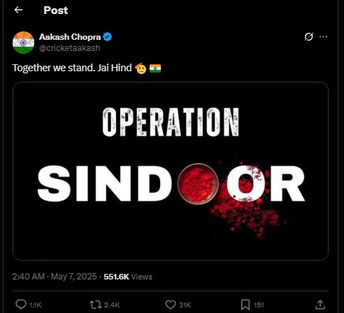 পাকিস্তানে হামলা চালানোয় ভারতীয় বাহিনীকে ‘স্যালুট’ জানান গম্ভীর-আকাশ চোপড়া। তারা ভারতের বাহিনীর সমর্থনে ‘জয় হিন্দ’ স্লোগান তোলেন।