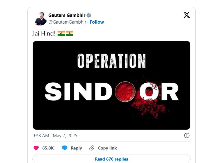 সামাজিক যোগাযোগমাধ্যম এক্সে (সাবেক টুইটার) এক পোস্টে গম্ভীর লেখেন, ‘জয় হিন্দ’। ওই পোস্টে একটি ছবিও যোগ করেন, যা ভারতীয় সেনাবাহিনী কর্তৃক ইনস্টাগ্রামে প্রকাশিত ছবি। যেখানে লেখা- ‘অপারেশন সিঁদুর’।